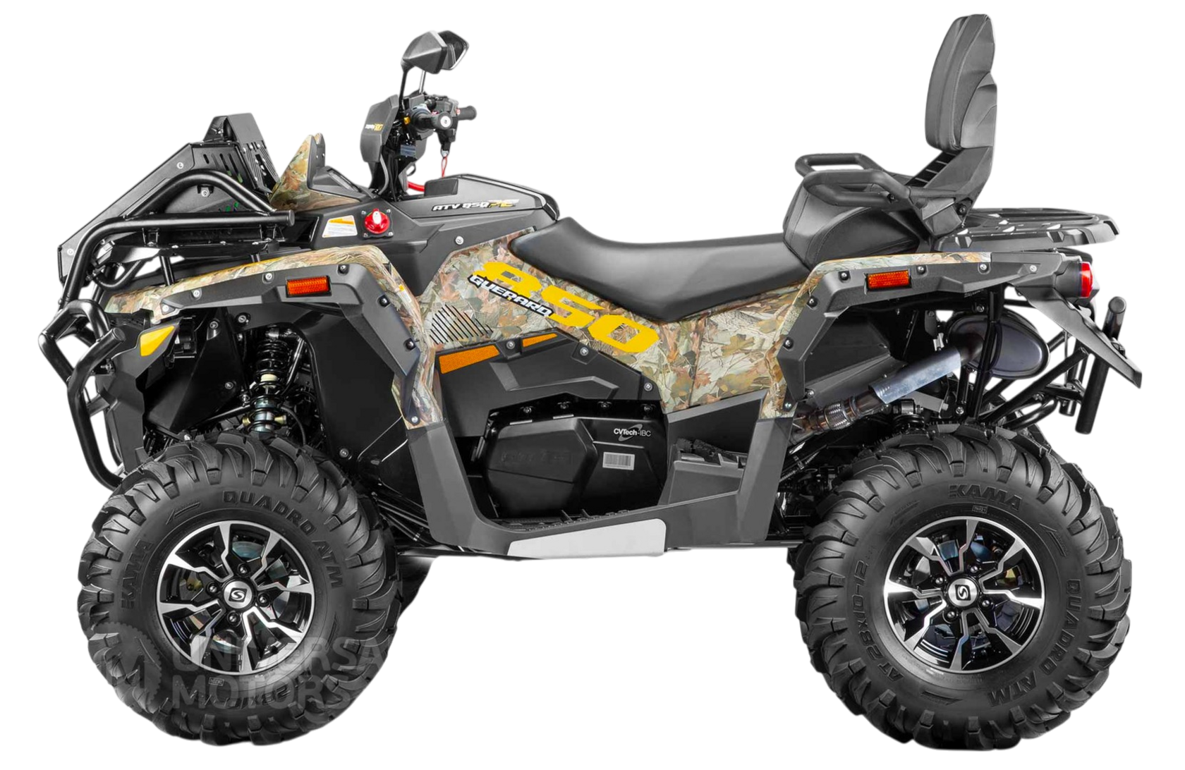 - Мощь флагманского двигателя 850 см³: Сердце квадроцикла — невероятно мощный и тяговитый двигатель, который обеспечивает уверенное движение по грязи, песку, снегу и крутым подъемам. Вариаторная коробка передач (CVT) делает управление простым и интуитивным, а выносной радиатор гарантирует стабильное охлаждение даже на самых низких скоростях.
