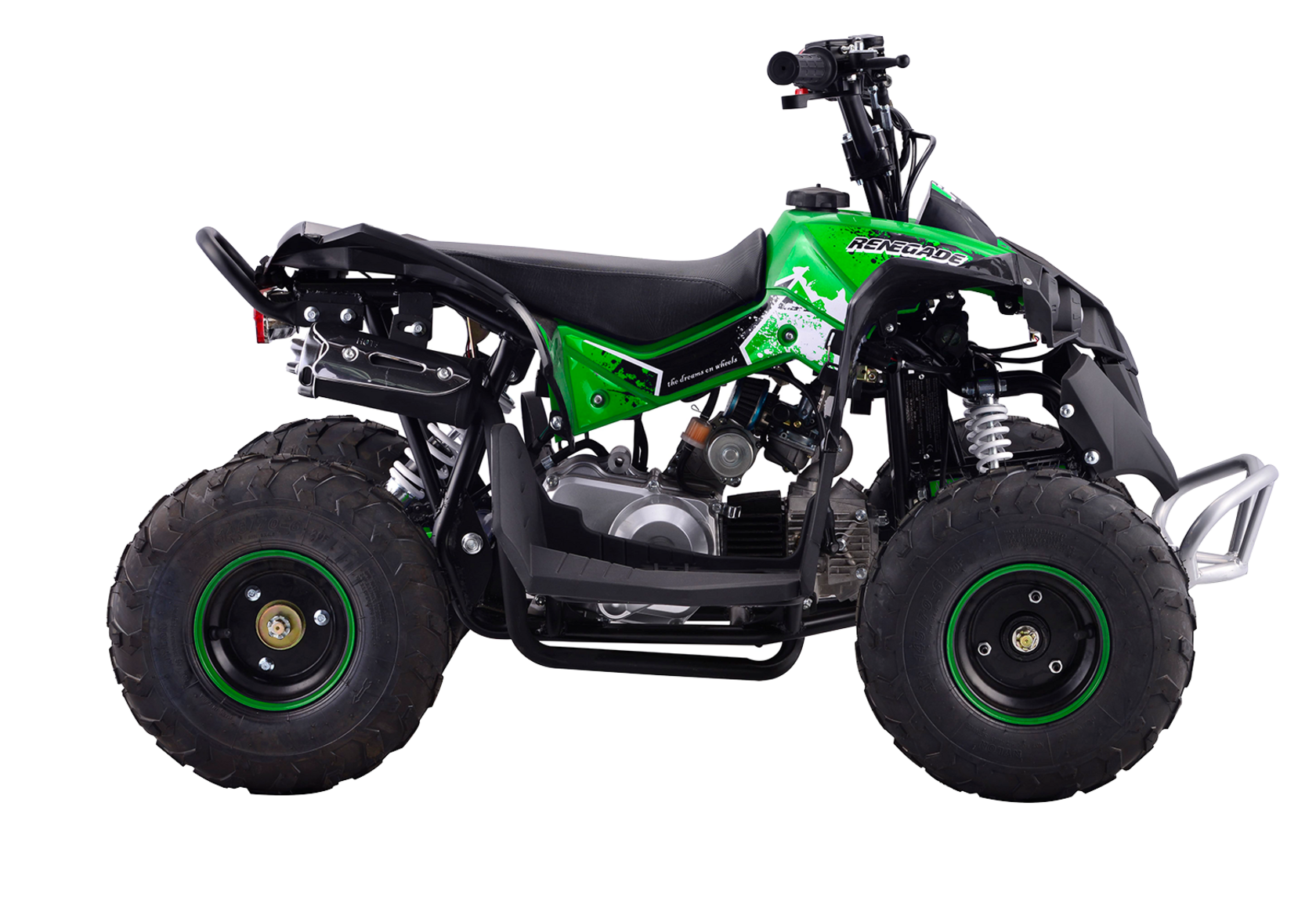 Бензиновый квадроцикл Квадроцикл YACOTA RENEGADE MINI предназначен для детей . Мототехника станет отличным подарком для ребенка и подарит ему незабываемые впечатления. Модель рассчитана на детей возрастом от 6 до 12 лет. На квадроцикле можно ездить по грунтовке и кататься по бездорожью. Модель оборудована четырехктактным бензиновым двигателем мощностью 7 л.с. Объем двигателя составляет 110 см3.
