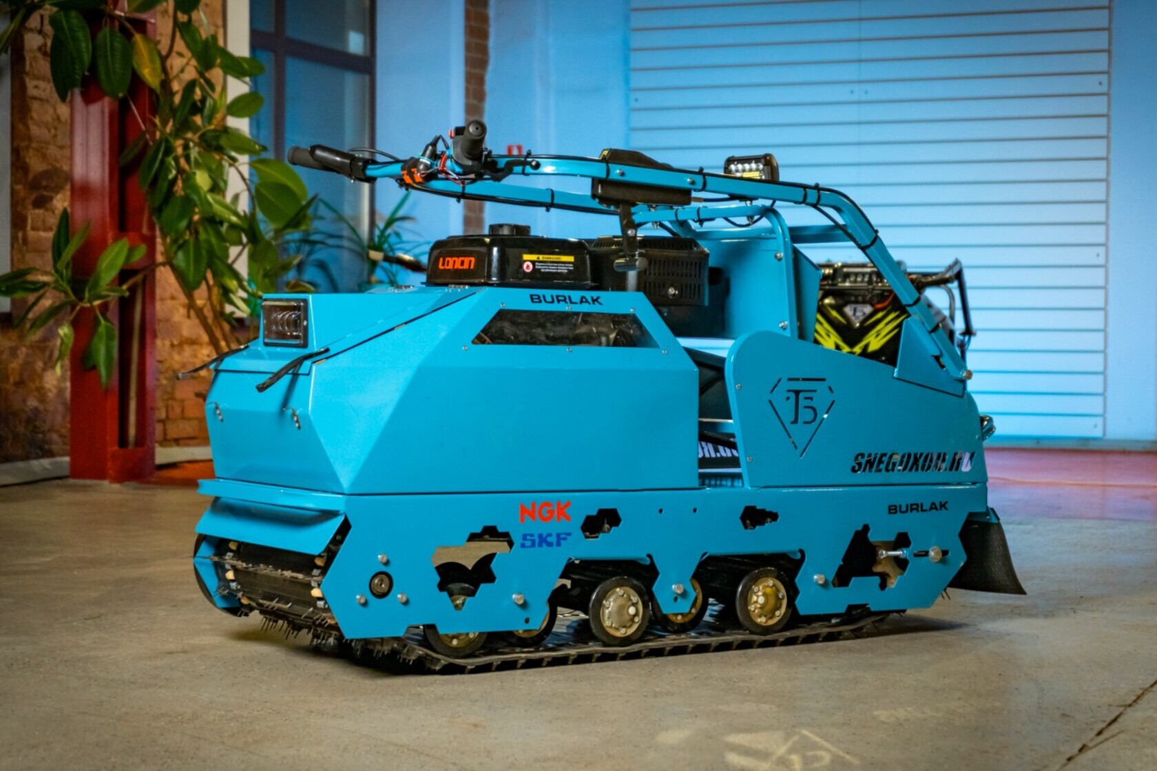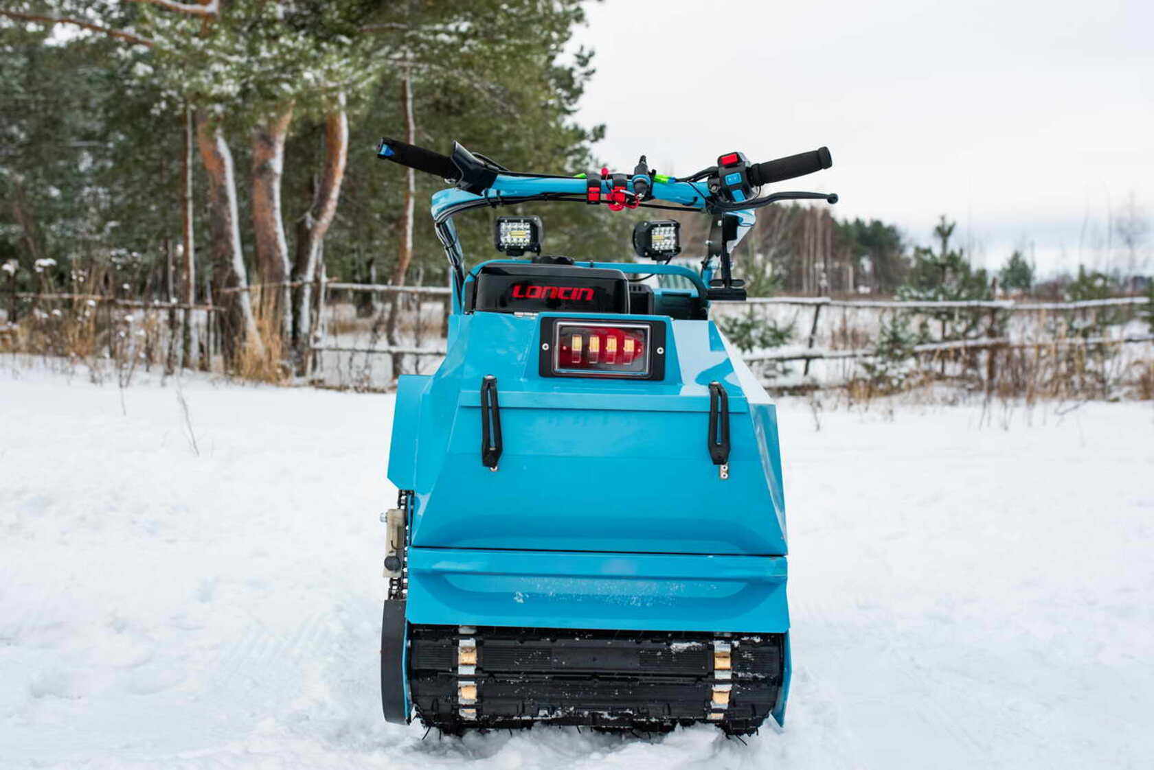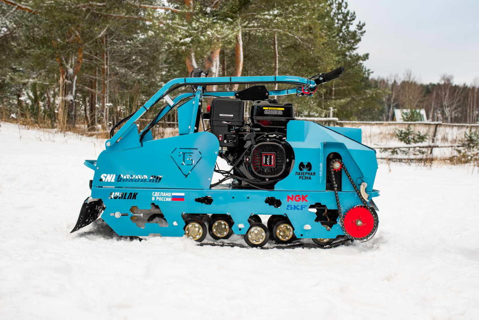 Реверс с рычагом переключения передач на руле, подогрев ручек руля и курка газа, неопреновые накладки на руль, съемный ящик для полезных мелочей, ручка-бампер, отсекатель снега, успокоитель цепи, фаркоп от снегохода «Тайга», брызговик