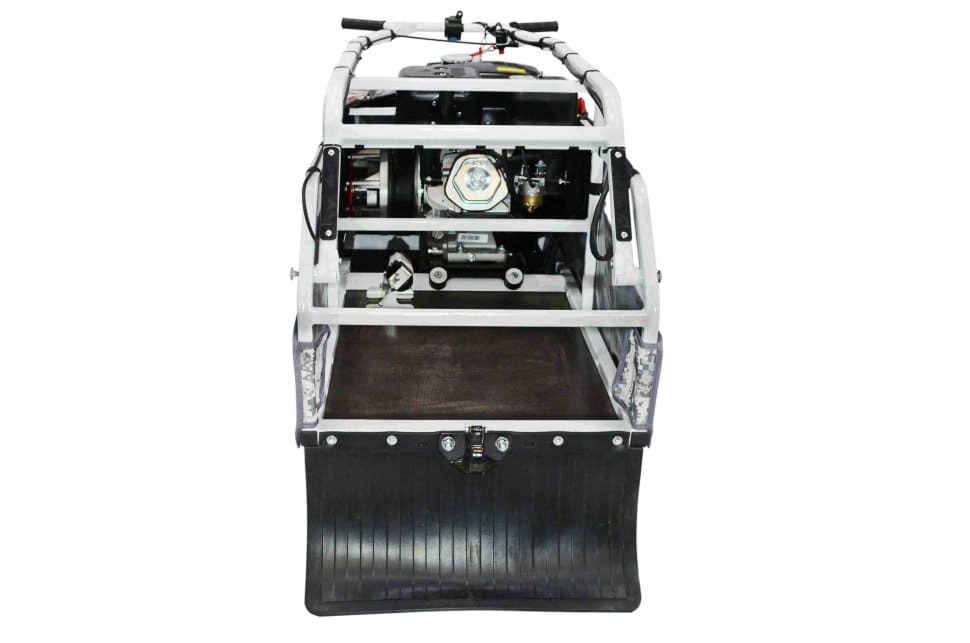 Мотособака весит 115 кг, а размер ее составляет 145 см в длину, 58 см в ширину и 84 см в высоту. Благодаря своей легкости и компактности, мотобуксировщик способен маневрировать и проходить по рыхлой и мягкой почве. К тому же мотобукс оснащен катковой подвеской, которая сглаживает ход, обеспечивает устойчивость на неровной поверхности, смягчает удары и вибрации от дороги.